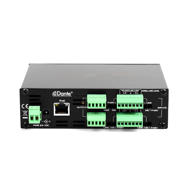ធាតុបញ្ចូលមីក្រូនិងបន្ទាត់ 4 ចំណុចប្រទាក់នេះគឺជាចំណុចប្រទាក់អូឌីយ៉ូអាជីពដែលមានមូលដ្ឋានលើពិធីការបណ្តាញ Dante ដែលគាំទ្រដល់មីក្រូហ្វូន / ខ្សែបញ្ចូលចំនួន 4 និង 4 ទិន្នផល។ គុណសម្បត្តិស្នូលរបស់វាគឺការបញ្ជូនសញ្ញាអូឌីយ៉ូដែលមានគុណភាពខ្ពស់និងមធ្យមបណ្តាញដែលសមស្របសម្រាប់សេណារីយ៉ូដែលតម្រូវឱ្យមានខ្សែភ្លើងដែលអាចបត់បែនបានឬសមាហរណកម្មផលិតកម្មប្រព័ន្ធសន្និសីទគឺសមរម្យហើយដូច្នេះនៅលើ។